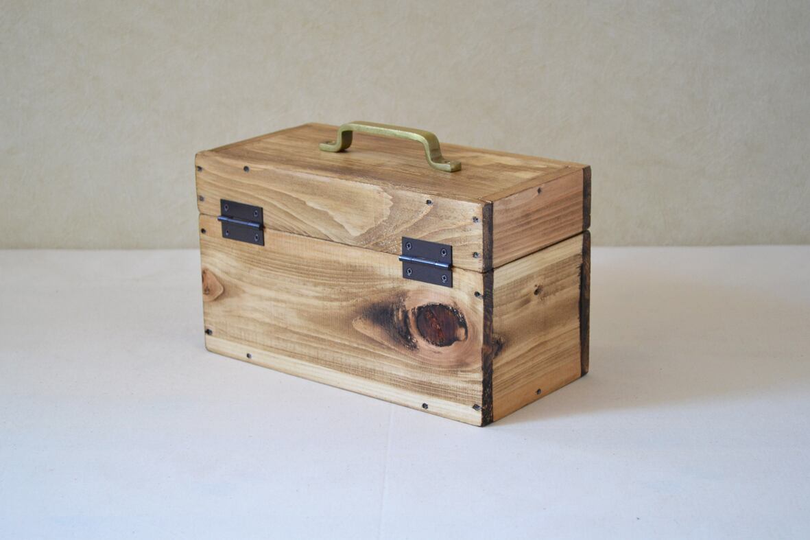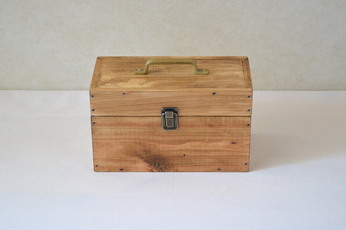 硬くていい香りの国産のひのきを使ったトランク型の小箱です。