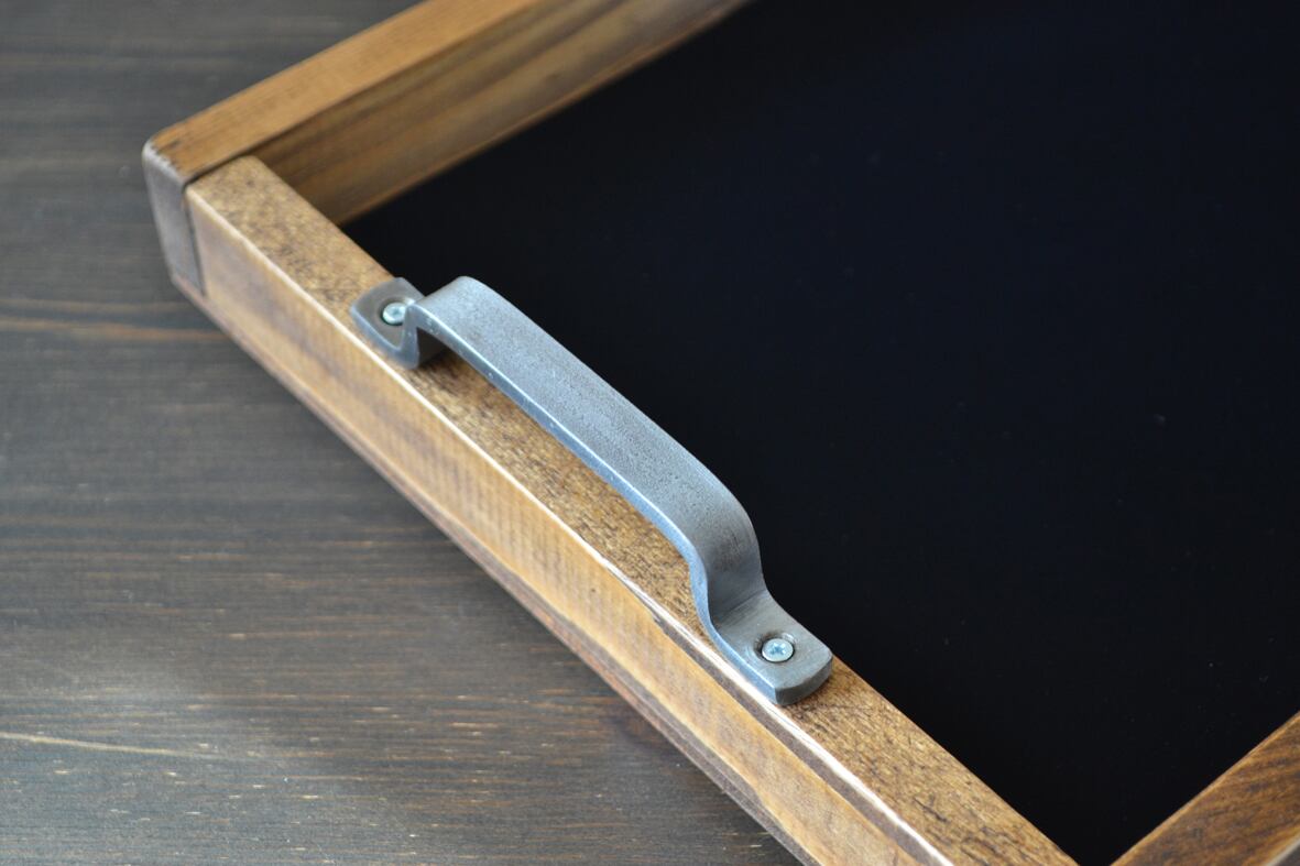 蜜蝋ワックスを使用した木製のシンプルなカフェトレイに、上品なベロア生地を敷き、各種アイアン取っ手を付けました。