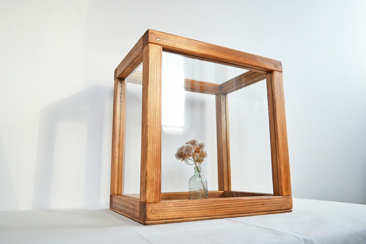 3cm角の杉材に溝を掘り、3ミリ厚のフロートガラスを挟んで組み立てています。