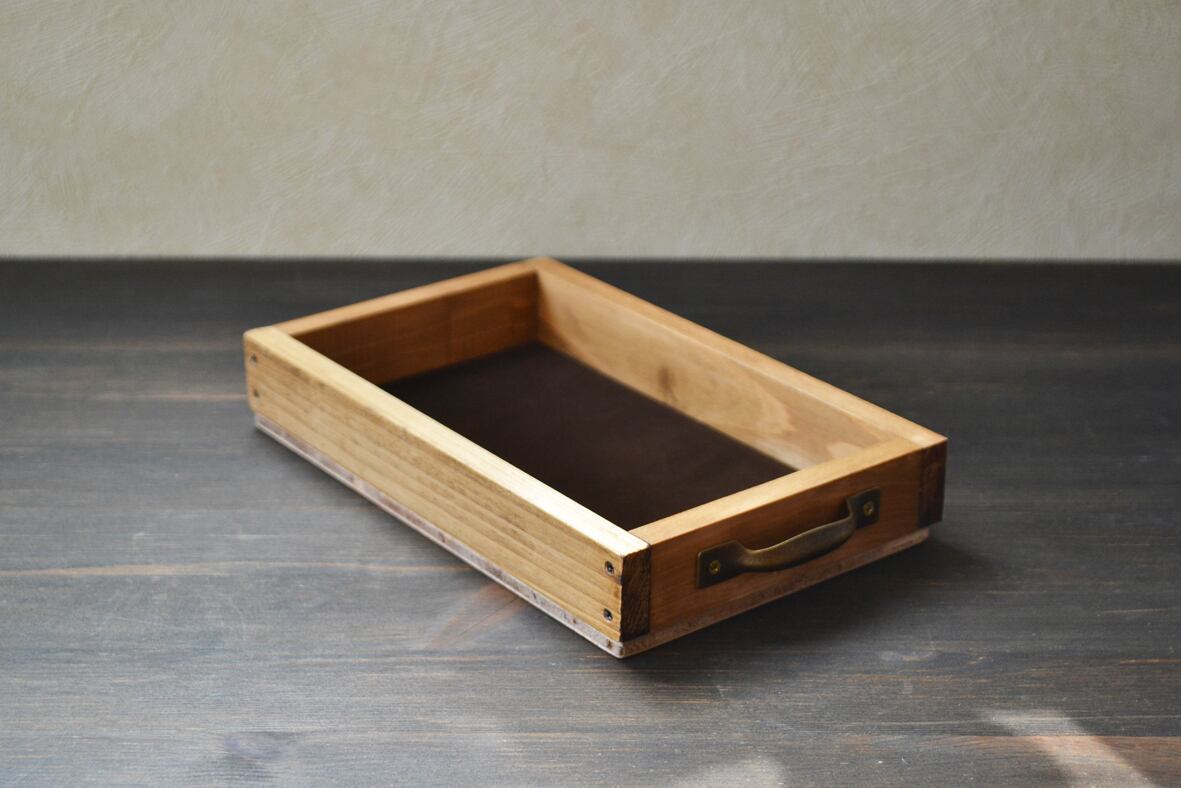 シンプルなカフェトレイに上質なベロア生地(こげ茶色)を敷き、アンティークゴールドの取手をつけました。