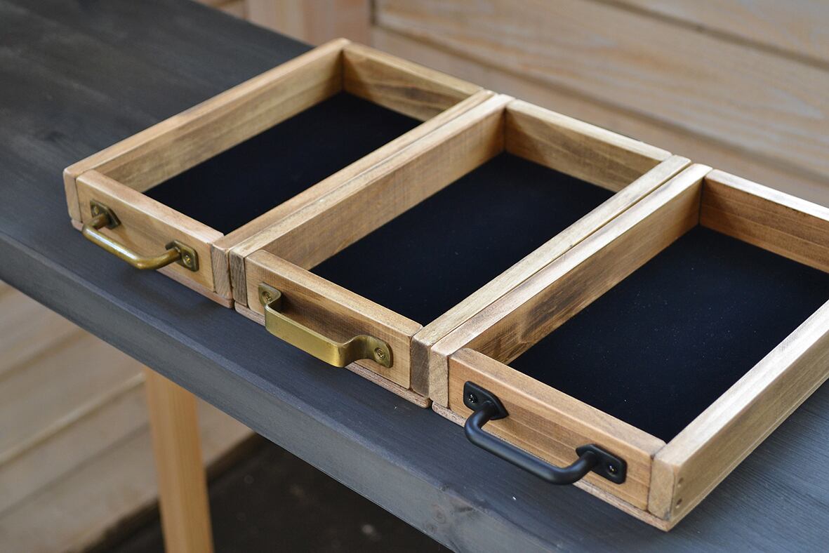 シンプルなカフェトレイに上質なベロア生地を敷き、黒のアイアン取手をつけました。